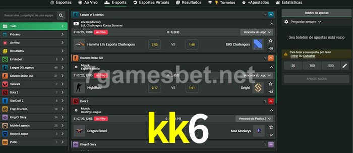 O kk6 oferece uma grande seleção de opções de apostas em e-sports com probabilidades competitivas